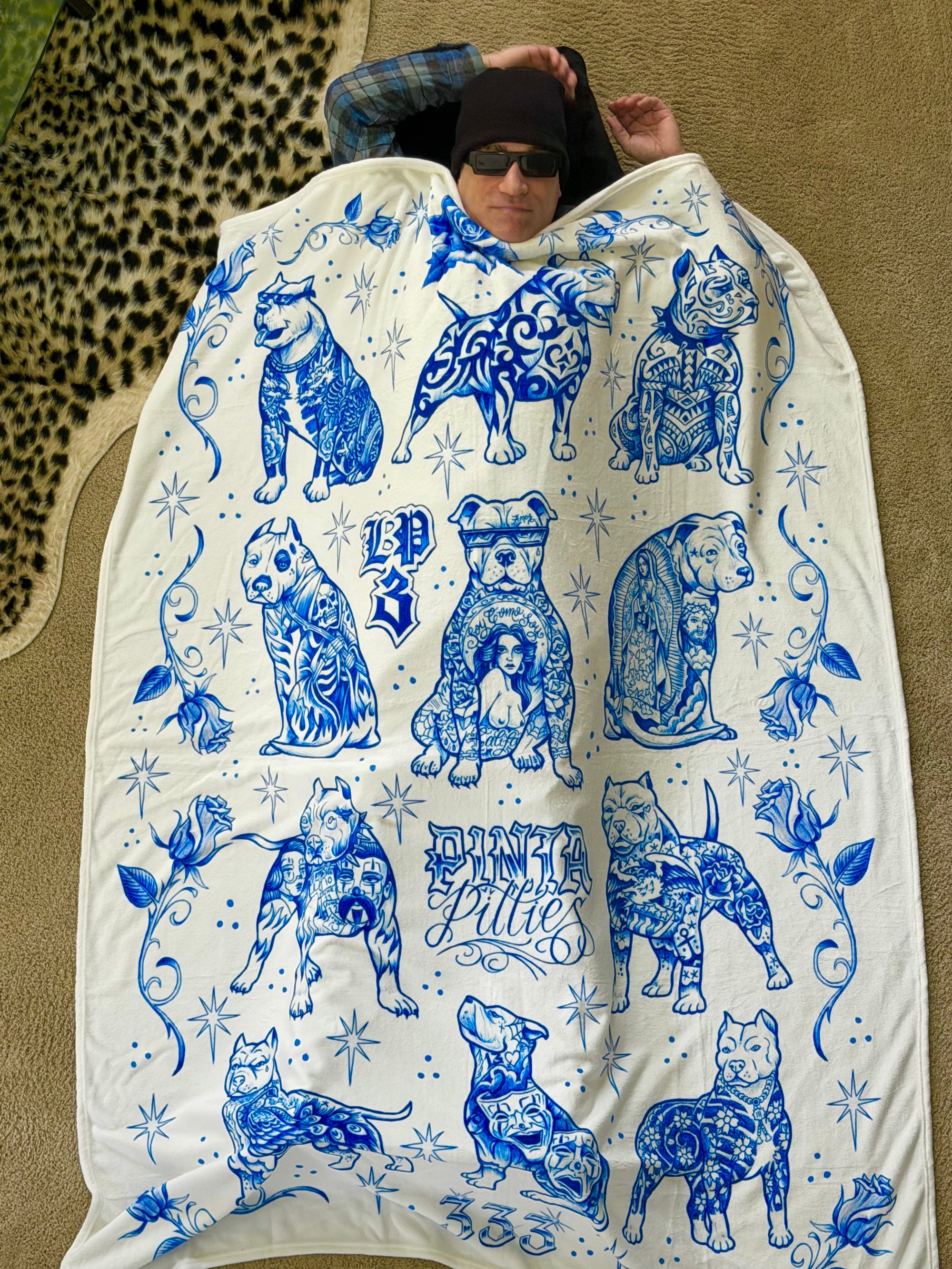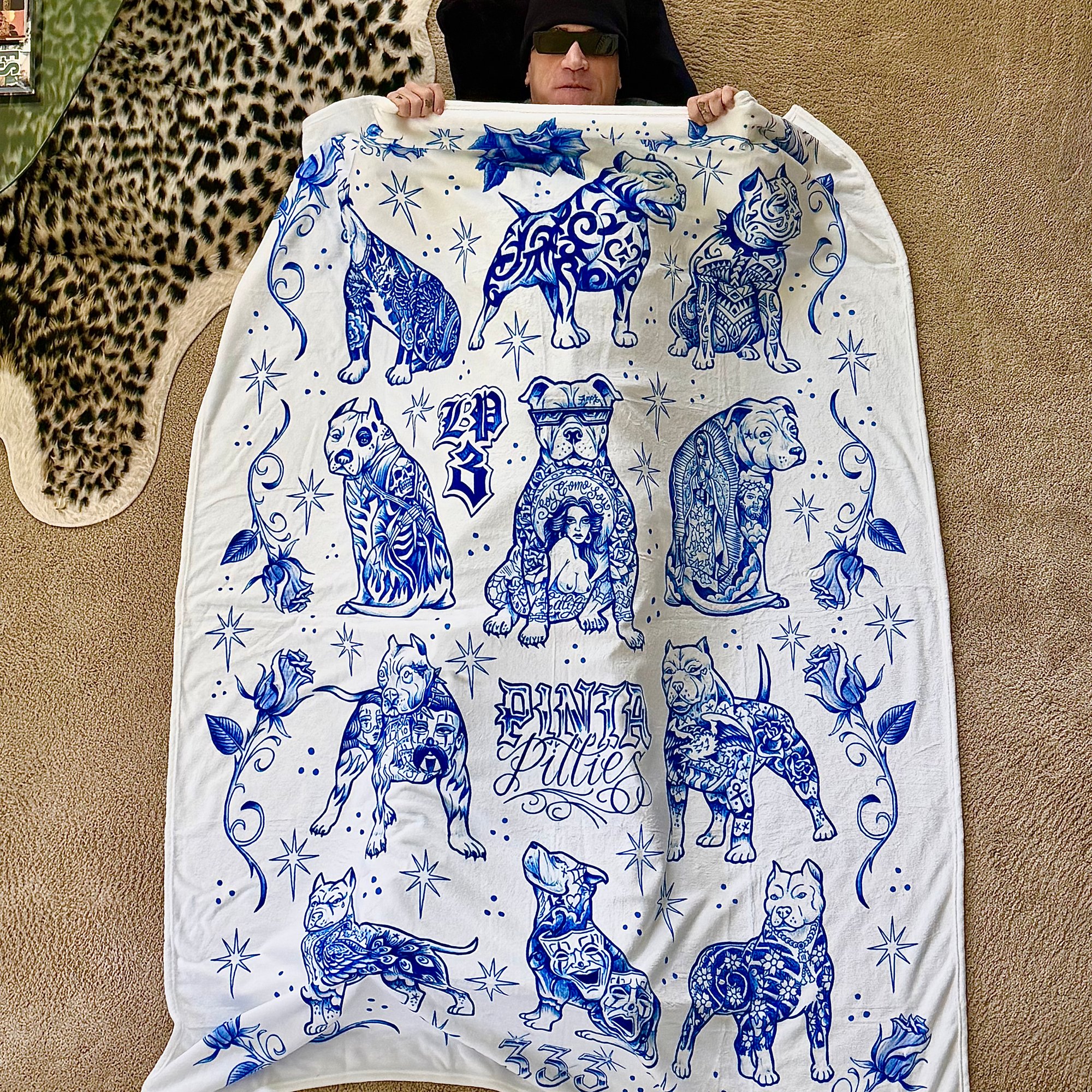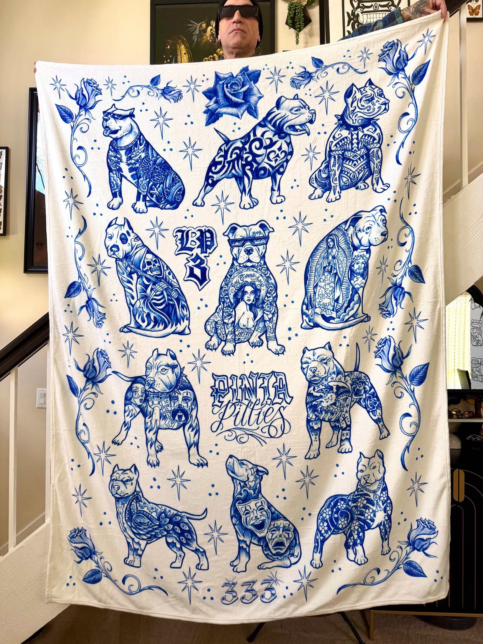 Wrap yourself in art with this oversized tattoo-inspired fleece blanket featuring original pitbull flash designs, roses, stars, and ornamental detailing in a bold blue-and-cream palette. Perfect for tattoo lovers, dog enthusiasts, and anyone who appreciates Chicano-influenced artwork.